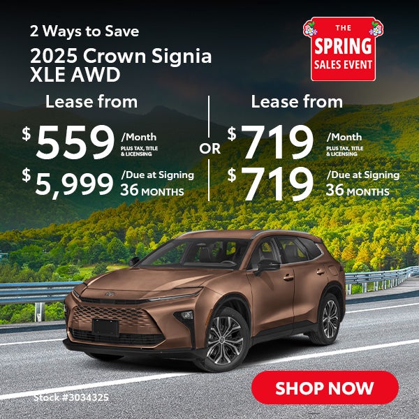 Terms available on approved credit through Toyota Financial Services (TFS) at participating Toyota dealers. Not all customers qualify. Lease example based on 2025 Crown Signia XLE AWD with Total SRP of $47845, net capitalized cost of $39781, and a lease end purchase amount of $26315. $5999 Due At Signing includes $5999 customer down payment, first month's payment of $559 for 36 months, and a $750 Acquisition Fee. OR Lease example based on 2025 Crown Signia XLE AWD with Total SRP of $47845, net capitalized cost of $45136, and a lease end purchase amount of $26315. $719 Due At Signing includes $719 customer down payment, first month's payment of $719 for 36 months, and a $750 Acquisition Fee. Security deposit required with exception of prior Toyota Financial Services (TFS) financing history and/or TFS credit rating in which a security deposit may be waived. Tax, title, license are extra. Cash from TMS must be applied as a capitalized cost reduction (down payment) that is excluded from due at signing; no cash back option. Dealer contribution may vary and could affect lease payment. Individual dealer prices, monthly payment, and other terms and offers may vary. Must lease from participating dealer's stock and terms are subject to vehicle availability. Lessee responsible for maintenance, excess wear and use, and will pay $0.15 per mile for all mileage over 30000 miles. $350 disposition fee is due at lease end. Doc Fee: $85. Cannot be combined with TFS Finance Cash, Down Payment Assistance, Trade-in Assistance, Customer Cash, APR, Finance Subvention Cash. Offer available in CA regardless of buyer's residency; void where prohibited. Expires Mon May 04 2026 00:00:00 GMT-0700 (Pacific Daylight Time). Dealer sets final price. See your participating Toyota dealer for details. Toyota Financial Services is a service mark used by Toyota Motor Credit Corporation (TMCC). Retail installment accounts may be owned by TMCC or its securitization affiliates and lease accounts may be owned by Toyota Lease Trust (TLT) or its securitization affiliates. TMCC is the servicer for accounts owned by TMCC, TLT, and their securitization affiliates. VIN: 3034325.