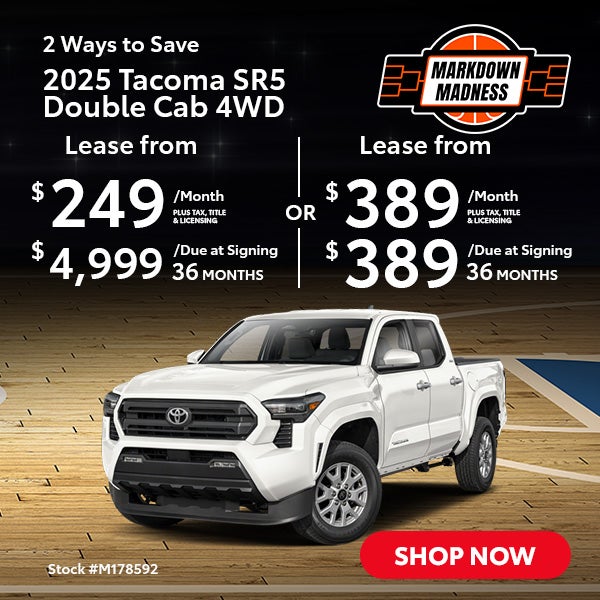 Terms available on approved credit through Toyota Financial Services (TFS) at participating Toyota dealers. Not all customers qualify. Lease example based on 2025 Tacoma SR5 Double Cab 4WD with Total SRP of $43818, net capitalized cost of $42121, and a lease end purchase amount of $27289. $389 Due At Signing includes $389 customer down payment, first month's payment of $389 for 36 months, and a $750 Acquisition Fee. OR Lease example based on 2025 Tacoma SR5 Double Cab 4WD with Total SRP of $43818, net capitalized cost of $37463, and a lease end purchase amount of $27289. $4999 Due At Signing includes $4999 customer down payment, first month's payment of $249 for 36 months, and a $750 Acquisition Fee. Security deposit required with exception of prior Toyota Financial Services (TFS) financing history and/or TFS credit rating in which a security deposit may be waived. Tax, title, license are extra. Cash from TMS must be applied as a capitalized cost reduction (down payment) that is excluded from due at signing; no cash back option. Dealer contribution may vary and could affect lease payment. Individual dealer prices, monthly payment, and other terms and offers may vary. Must lease from participating dealer's stock and terms are subject to vehicle availability. Lessee responsible for maintenance, excess wear and use, and will pay $0.15 per mile for all mileage over 30000 miles. $350 disposition fee is due at lease end. Doc Fee: $200. Cannot be combined with TFS Finance Cash, Down Payment Assistance, Trade-in Assistance, Customer Cash, APR, Finance Subvention Cash. Offer available in CA regardless of buyer's residency; void where prohibited. Expires Tue Mar 31 2026 00:00:00 GMT-0700 (Pacific Daylight Time). Dealer sets final price. See your participating Toyota dealer for details. Toyota Financial Services is a service mark used by Toyota Motor Credit Corporation (TMCC). Retail installment accounts may be owned by TMCC or its securitization affiliates and lease accounts may be owned by Toyota Lease Trust (TLT) or its securitization affiliates. TMCC is the servicer for accounts owned by TMCC, TLT, and their securitization affiliates. VIN: M178592.